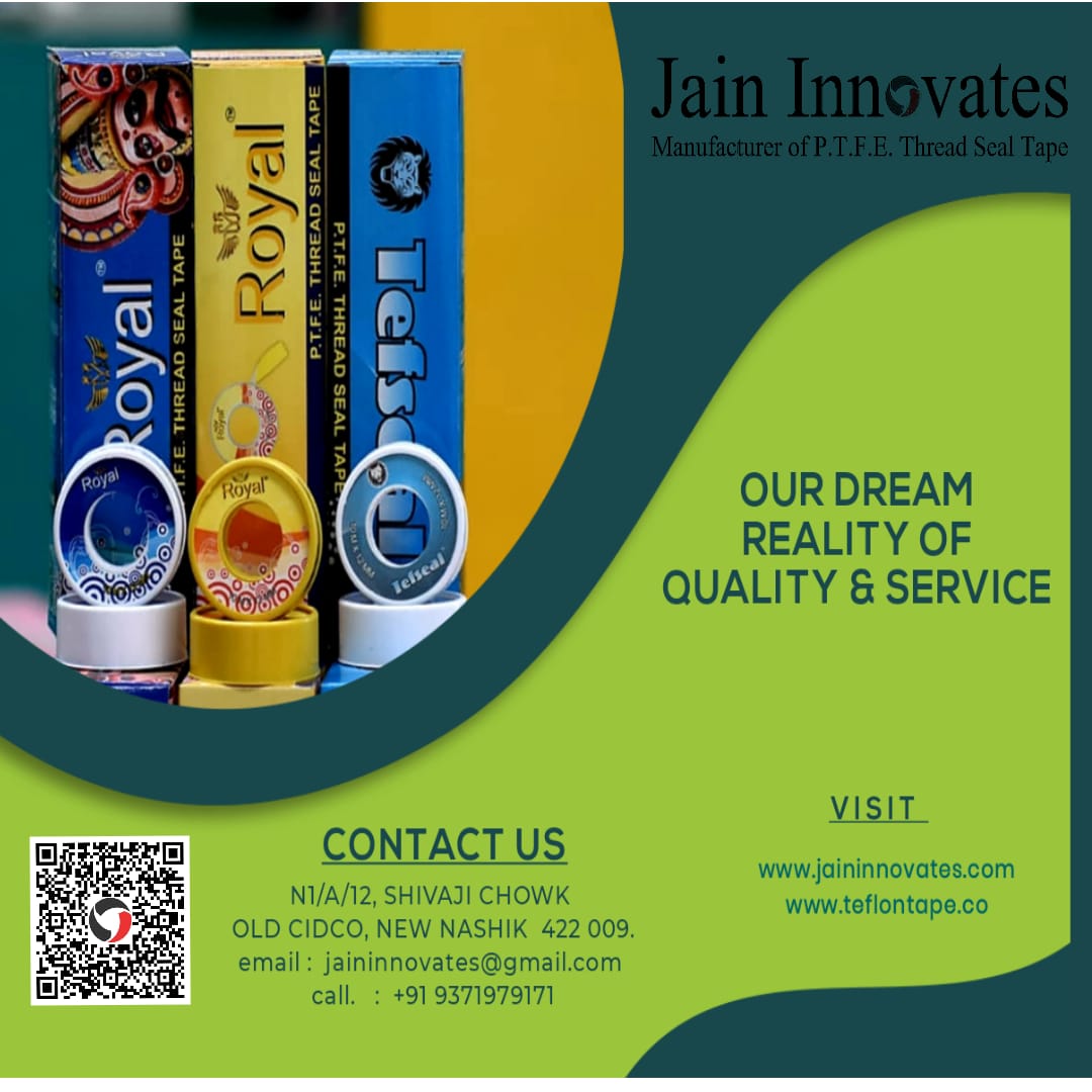 Located in NASHIK,Maharashtra,JAIN INNOVATES has been in the business of manufacturing quality Packaging Products. Establised in the year 1995, the base of the company business start with trading in manufacturing quality PTFE Seal Tape and Braided Packing and all types of P.T.F.E products.